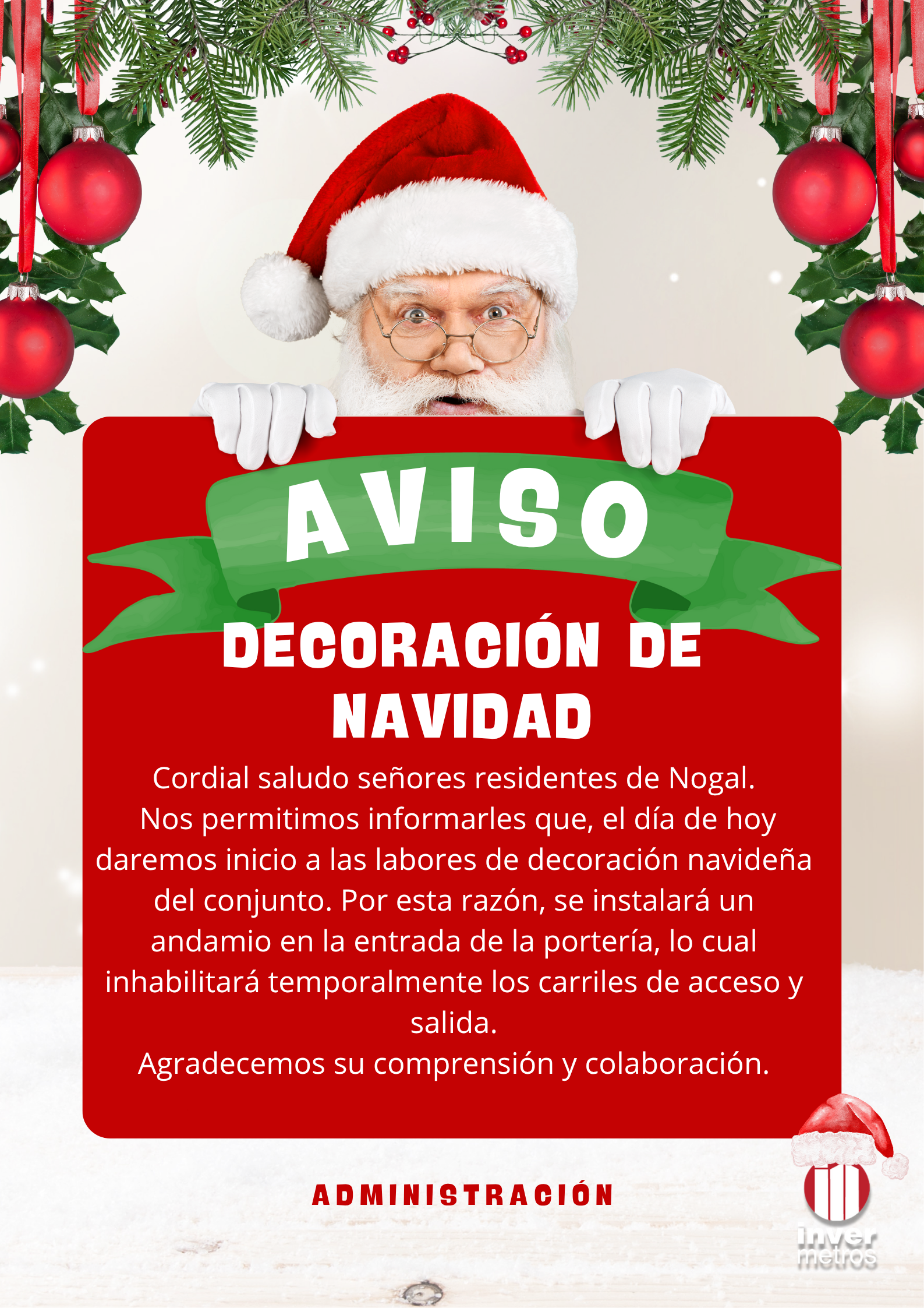 Cordial saludo señores residentes de Nogal. Nos permitimos informarles que, el día de hoy daremos inicio a las labores de decoración navideña del conjunto. Por esta razón, se instalará un andamio en la entrada de la portería, lo cual inhabilitará temporalmente los carriles de acceso y salida.