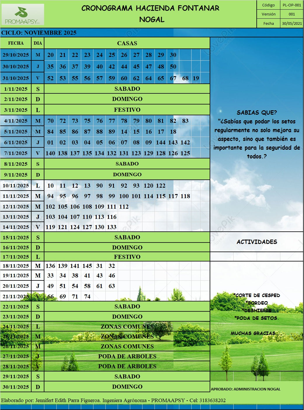 Adjuntamos el cronograma de jardinería para el mes de noviembre de 2025.